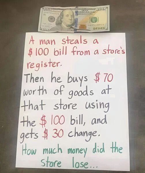 A man steals a $100 bill from a store’s register. Then he buys $70 worth of goods at that store using the $100 bill and gets a $30 change. How much money did the store lose?