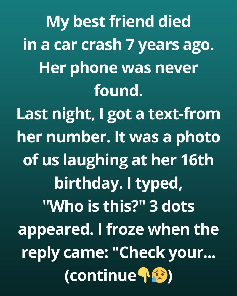 - My best friend died in a car crash 7 years ago. Her phone was never found. Last night, I got a text—from her number. It was a photo of us laughing at her 16th birthday. I typed, “Who is this?” 3 dots appeared. The reply came: “Check your inbox.”