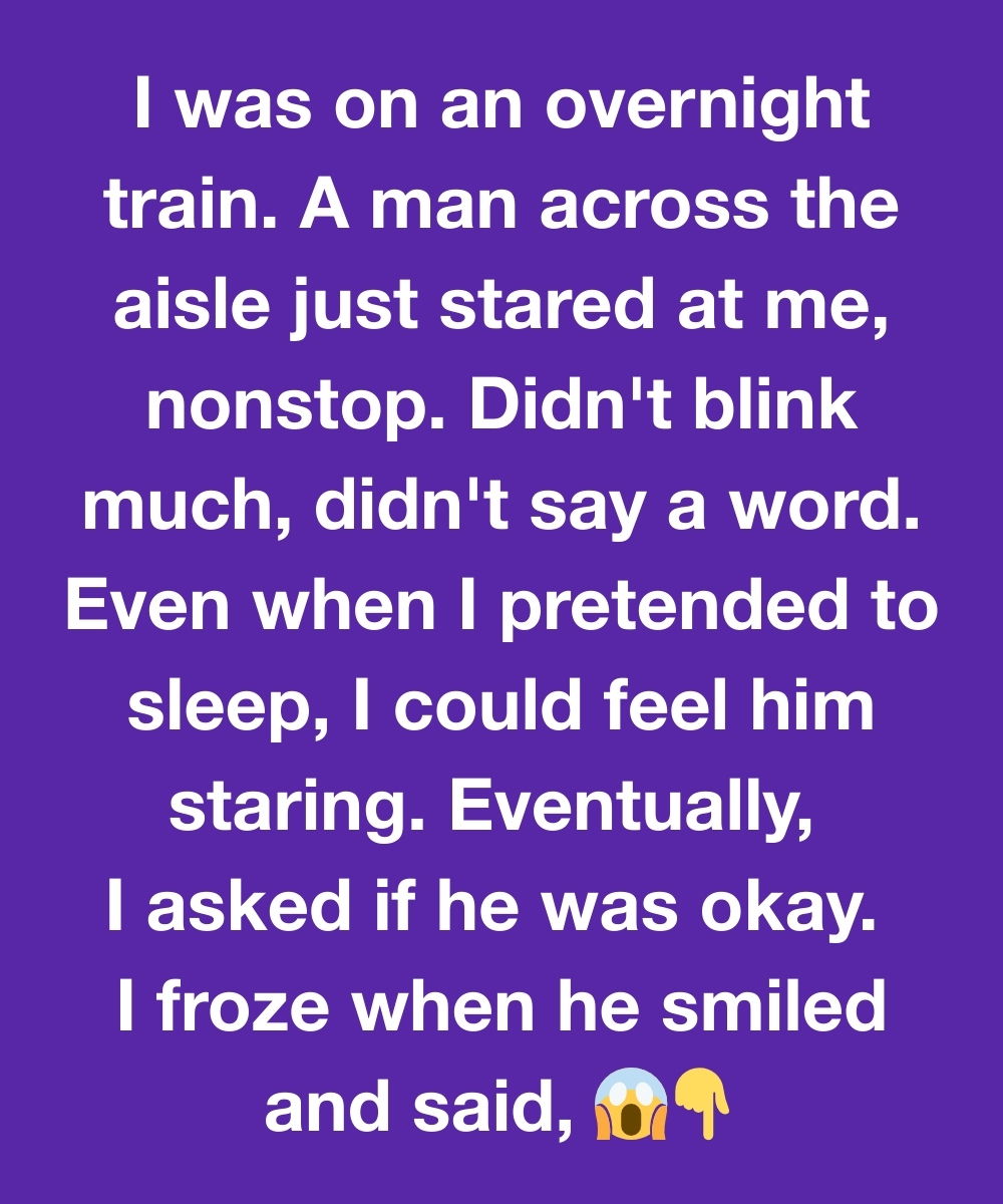 I was on an overnight train and had a window seat. A man across the aisle just stared at me, nonstop, for hours. Didn’t blink much, didn’t say a word, just watched. Even when I pretended to sleep, I could feel him staring.