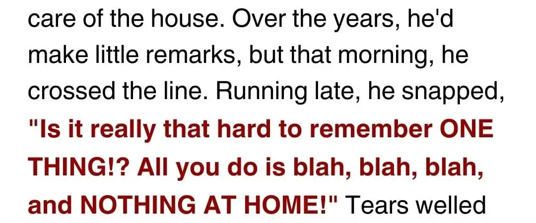 At first, I tried to brush it off. After all, he worked long hours to support us. But lately, it got worse and more personal. The remarks stung.