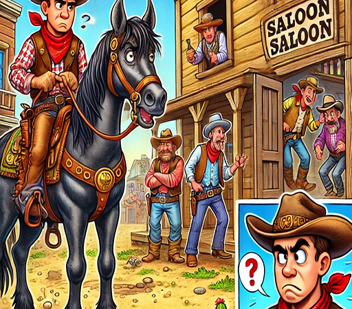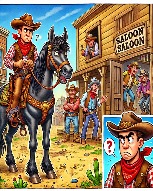 A cowboy, worn out from the trail and covered in dust, rides into town and ties up his horse outside the local saloon. After a well-deserved drink, he heads back outside, only to find that his horse is gone!