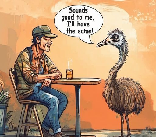 The emu chimes in, “Sounds good to me. Same for me, please.”