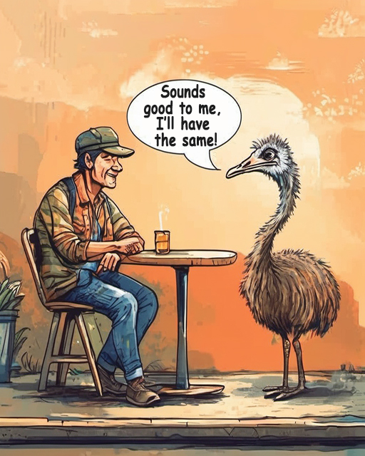 The emu chimes in, “Sounds good to me. Same for me, please.”