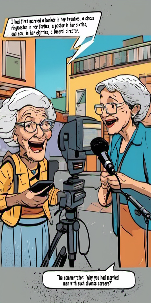 After a brief pause, the woman flashed a smile and said, “Well, I first married a banker in my 20s, then a circus ringmaster in my 40s, a pastor in my 60s, and now, in my 80s, a funeral director.”