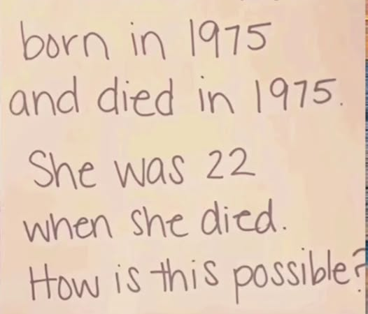 Here’s the riddle: “A woman was born in 1975 and died in 1975. She was 22 when she died. How is this possible?”