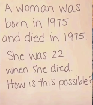 Here’s the riddle: “A woman was born in 1975 and died in 1975. She was 22 when she died. How is this possible?”