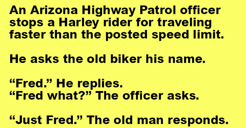A highway patrol officer in Arizona pulls over an older guy on a Harley for speeding. He asks the man his name.
