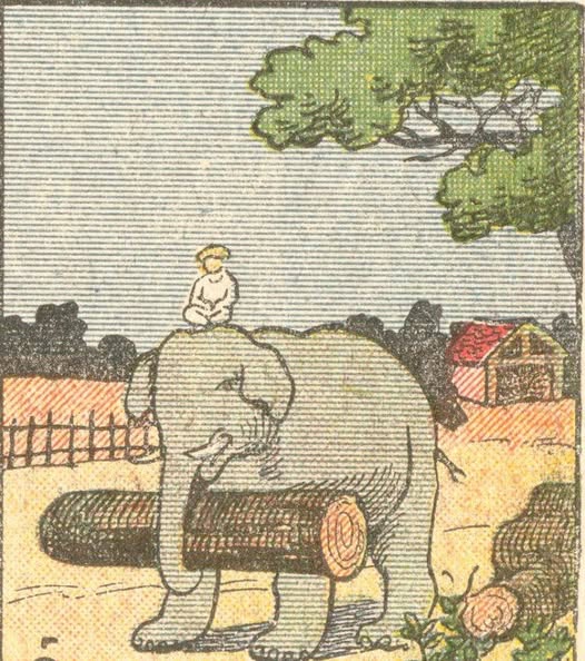 Now, look at today’s riddle. The picture shows an elephant with a rider, and the owner is using the elephant to carry large logs for building a house. But there’s also a horse hidden in the picture. Can you find the horse that the artist concealed?