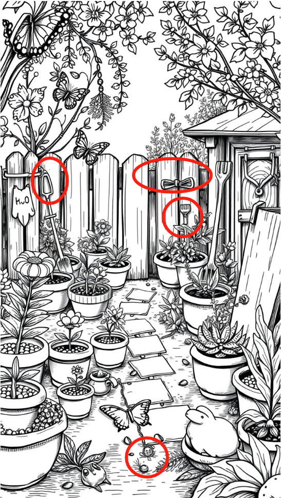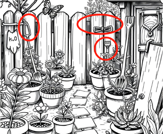 At first glance, the picture might look like a lovely, ordinary scene—but look closer. These four items are cleverly camouflaged, and spotting all of them will take some serious focus.