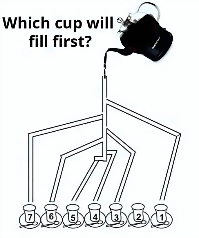 Take a close look at the image. To figure out which cup fills first, we need to follow the liquid’s path through the pipes. Spoiler alert: not all cups are in play!