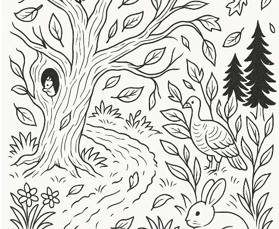 This black-and-white scene may look simple at first glance, but three curious creatures are cleverly hidden inside. Your job? Find them all: one feathered, one slithery, and one with hooves and horns!