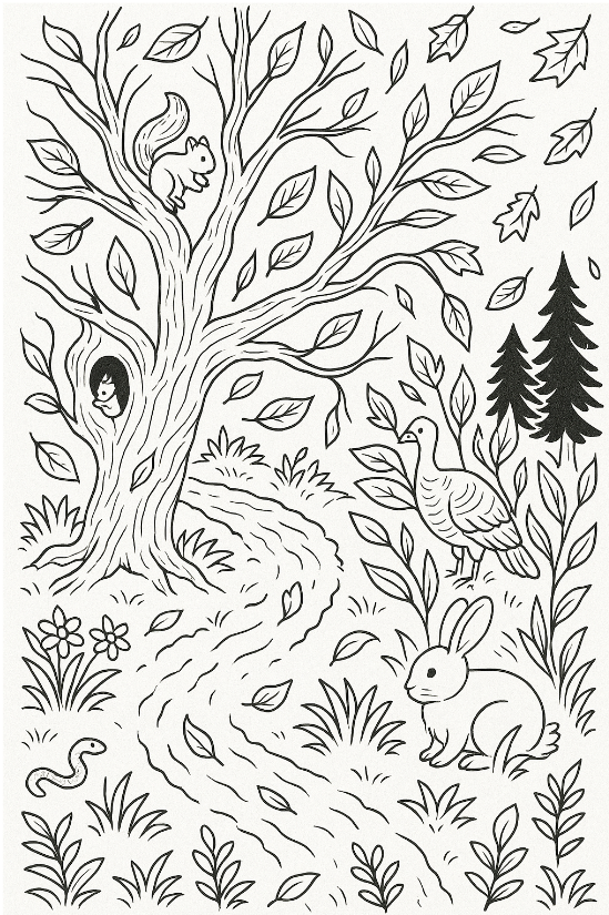 They’re all in there somewhere—tucked into the lines, curves, and cozy corners of the scene. Think of it like a walk in the woods: the longer you look, the more you see.