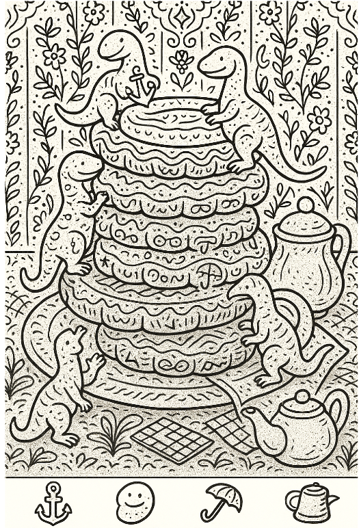 1. Hook 🪝 – Twisted, curved, or hanging just out of sight2. Smiley Face 😊 – A hidden grin somewhere in the lines3. Umbrella ☔ – Folded, open, or sheltering in the background4. Kettle 🫖 – Steaming or still, ready for tea