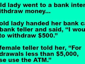 An elderly lady walks into a bank and hands her card to the teller, asking, “I’d like to withdraw $500.” The teller, a little impatient, responds, “For withdrawals under $5,000, please use the ATM.” The old lady looks at her, confused, and asks, “Why?” The teller, now visibly annoyed, snaps, …