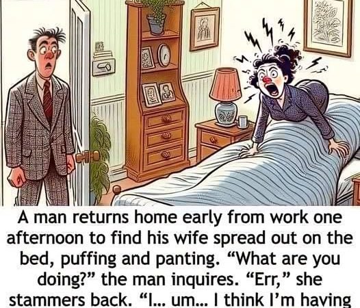 A man comes home earlier than expected and heads upstairs, only to find his wife lying on the bed, gasping for breath.