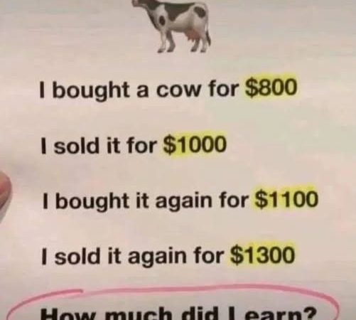 - Finally, you sell the cow again for $1,300, earning a profit of $200 from the first transaction and $200 from the second, for a total profit of $400.