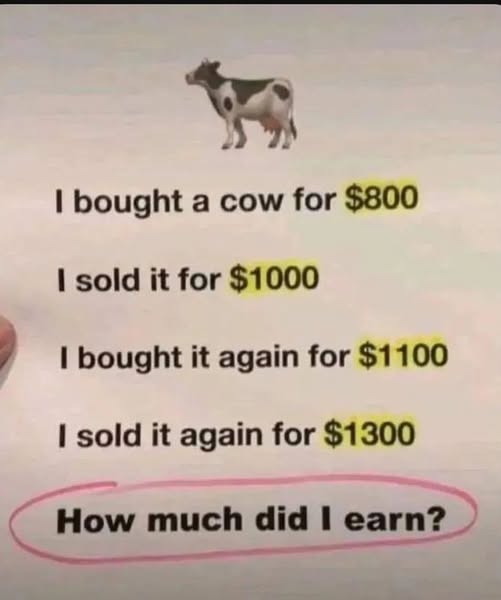 - Finally, you sell the cow again for $1,300, earning a profit of $200 from the first transaction and $200 from the second, for a total profit of $400.