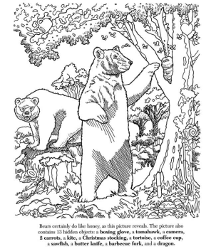 Buried within this image are 13 hidden objects waiting to be discovered: a boxing glove, a tomahawk, a camera, two carrots, a kite, a Christmas stocking, a tortoise, a coffee cup, a sawfish, a butter knife, a barbecue fork, and a dragon.