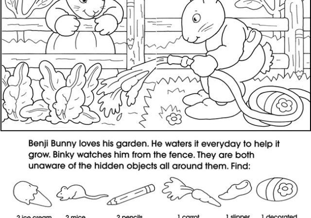 Benji Bunny loves tending to his garden, watering it every day to make it thrive. Meanwhile, Binky watches from the fence, completely unaware of the hidden objects scattered around them!