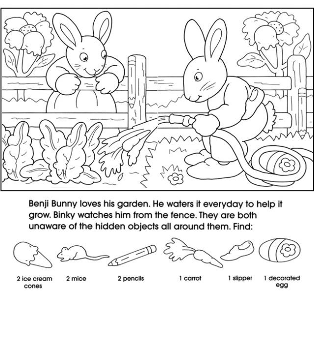 Benji Bunny loves tending to his garden, watering it every day to make it thrive. Meanwhile, Binky watches from the fence, completely unaware of the hidden objects scattered around them!
