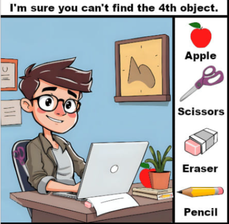 Take on this seek-and-find puzzle set in a cozy bedroom scene. Your mission: spot the 4 hidden items— a apple, an scissors a eraser, and a pencil—hidden in plain sight.
