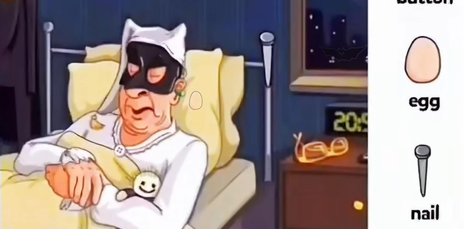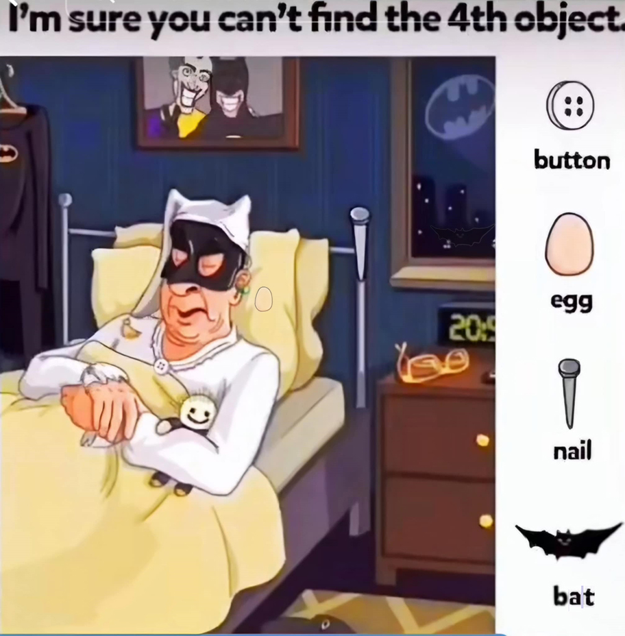 At first glance, this picture looks ordinary, but hidden within it are four sneaky objects: a Button, Egg, Nail, and Bat. ?