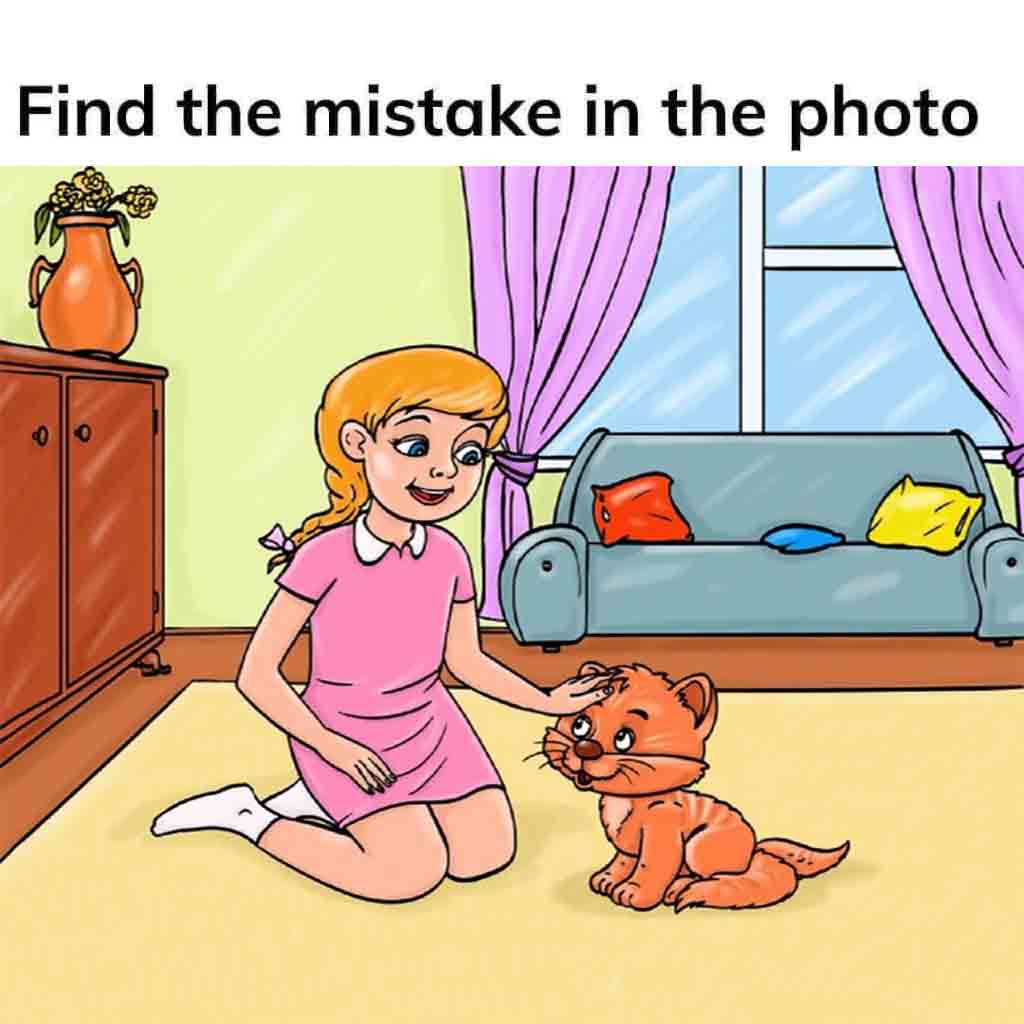 In this brain puzzle, you need to identify the mistake in the Picture where a girl is petting her cat inside the living room of her house. At first, you probably won’t identify the mistake immediately as it’s a fine detail than you might think. But after a few moments, you might be able to identify the mistake in the picture.