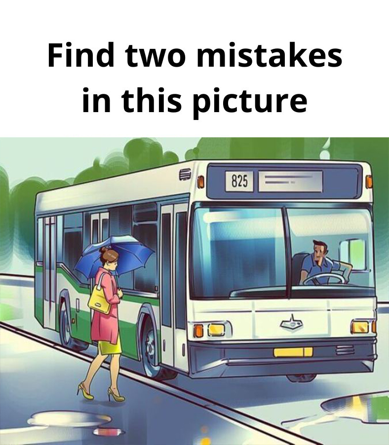 In the image below, you’ll see a bus stop scene with a lady boarding the bus. At first glance, everything seems totally normal… but don’t be fooled! There are 2 sneaky mistakes hiding in plain sight.