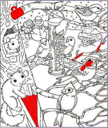 At first glance, this picture looks like a chaotic jumble of shapes. But hidden inside are five sneaky objects: an Umbrella, Beaver, Pencil, Mug, and Fork.