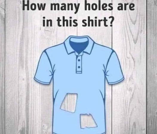 Take your time. Think about how many holes are in this T – shirt. There are likely more than you might initially think. Let your brain work before choosing an answer.