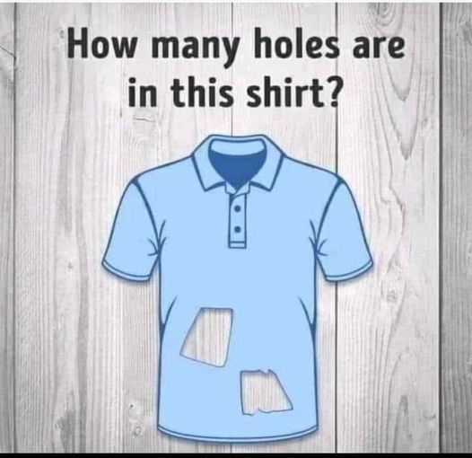Take your time. Think about how many holes are in this T – shirt. There are likely more than you might initially think. Let your brain work before choosing an answer.