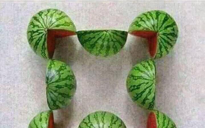 This is a pretty example of food photography, but it also holds a visual math riddle. There are four halved watermelons and four watermelons missing a quarter. Therefore, if you could put these watermelons together like a puzzle, how many whole watermelons are in this picture? Careful, fractions could get tricky.