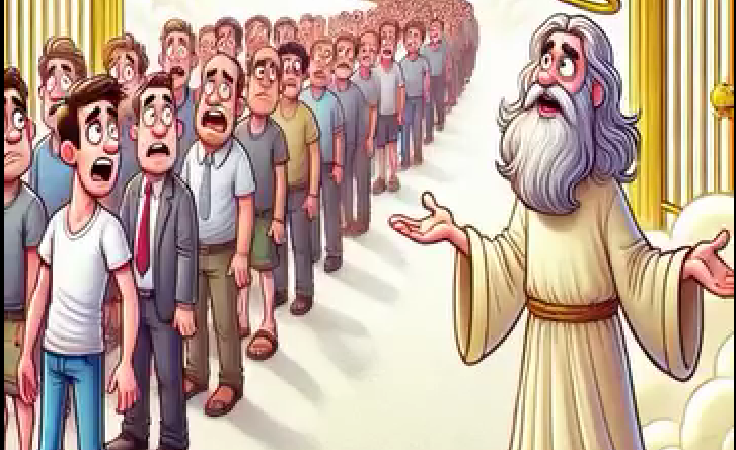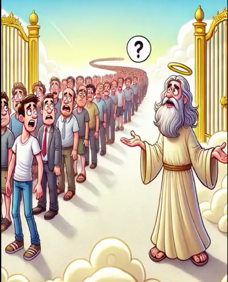 God comes and says, “I want the men to make two lines. One line for the men that dominated their women on earth and the other line for the men that were dominated by their women. Also, I want all the women to go with St. Peter.”