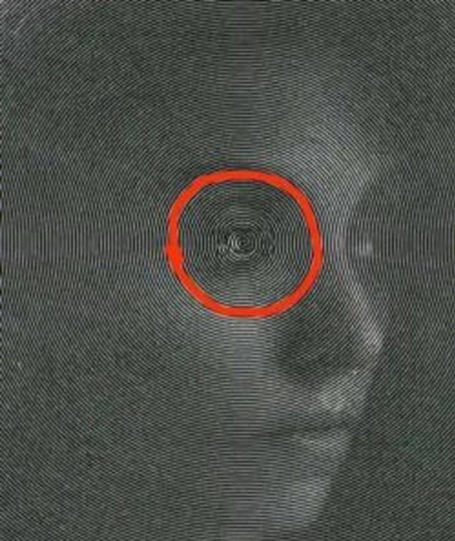 It sounds like you’re describing a hidden image puzzle, where a number is cleverly hidden within an intricate pattern of spirals and shading in an image of a young woman.