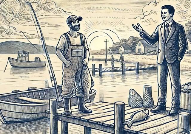 The businessman scoffed. “I am a Wharton MBA and could help you. You should spend more time fishing and with the proceeds, buy a bigger boat. With the proceeds from the bigger boat you could buy several boats. Eventually you would have a fleet of fishing boats. Instead of selling your catch to a middleman you would sell directly to the processor, eventually opening your own cannery. You would control the product, processing and distribution. You would need to leave this small coastal fishing village and move to Mexico City, then LA and eventually NYC where you will run your expanding enterprise.”