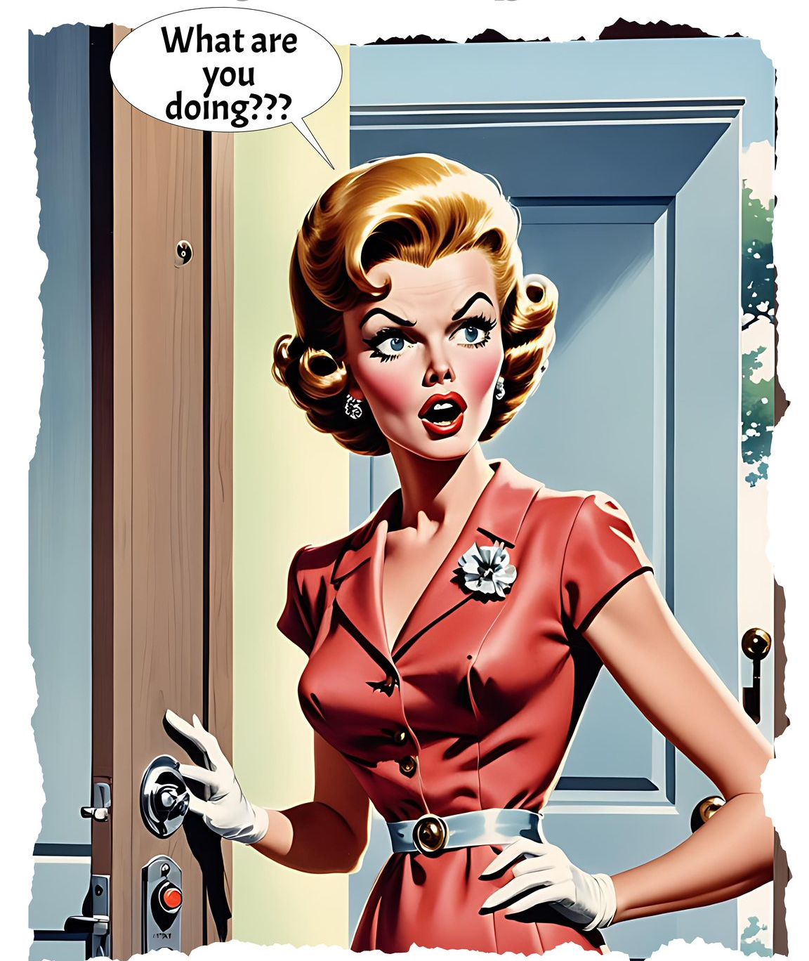 Finally, her husband got home. He walked in and saw her standing without clothes by the door.