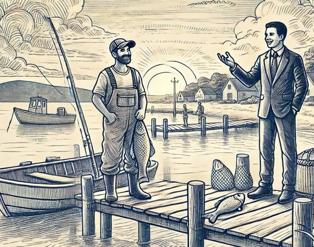 The businessman scoffed. “I am a Wharton MBA and could help you. You should spend more time fishing and with the proceeds, buy a bigger boat. With the proceeds from the bigger boat you could buy several boats. Eventually you would have a fleet of fishing boats. Instead of selling your catch to a middleman you would sell directly to the processor, eventually opening your own cannery. You would control the product, processing and distribution. You would need to leave this small coastal fishing village and move to Mexico City, then LA and eventually NYC where you will run your expanding enterprise.”