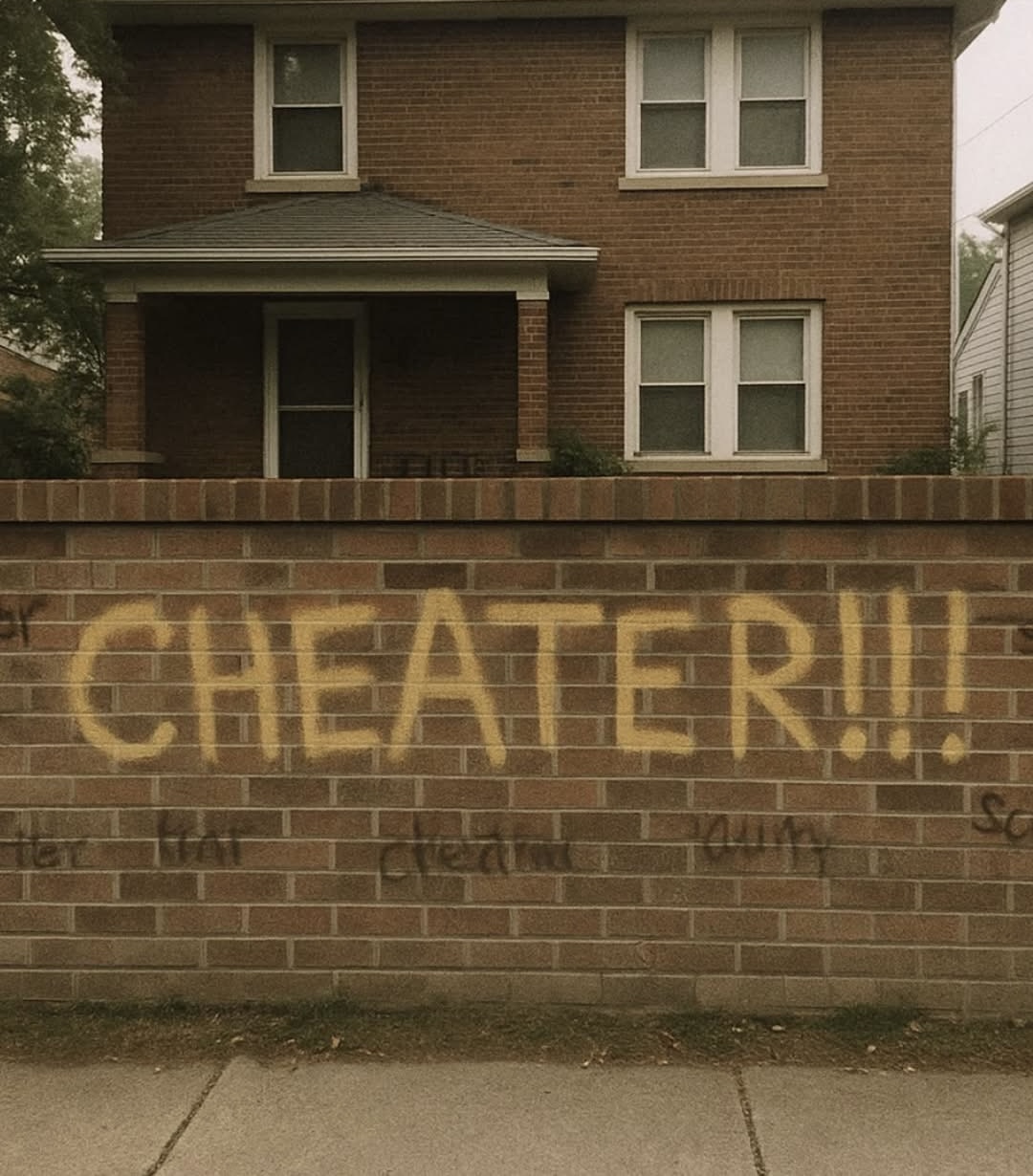 I followed him to the front window, still rubbing sleep from my eyes. Across the street, the fence of my old house was covered in spray paint. Bright yellow letters spelled out words I won’t repeat here, but they were about me, Oscar, and the nasty things Kevin thought of our relationship.
