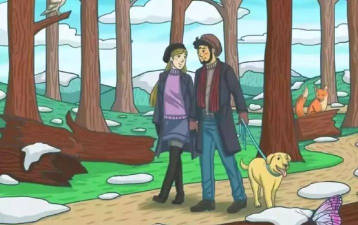 At first glance, it’s a peaceful forest scene—a couple strolling with their loyal dog. You might notice a pink butterfly, a sneaky fox, and a wise owl…