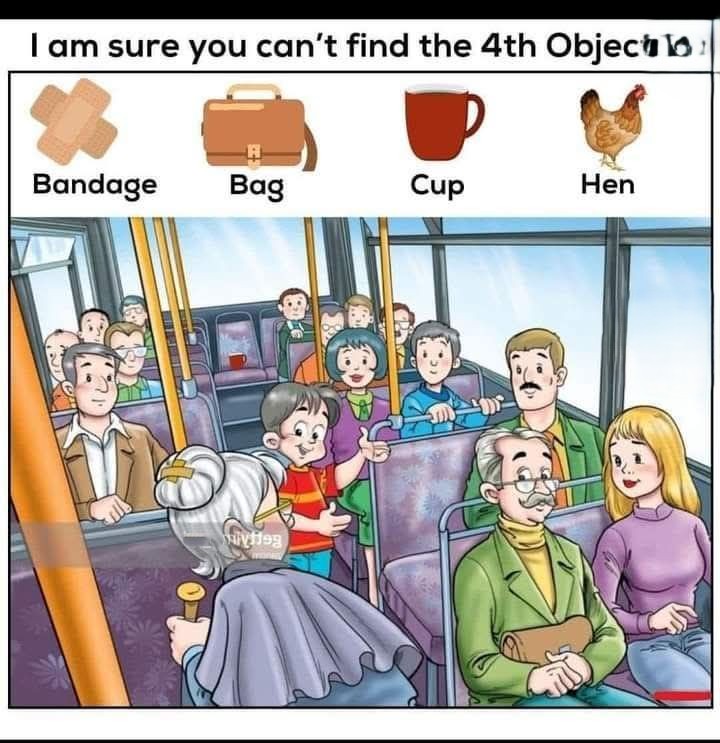 This isn’t your average “find-the-object” game — somewhere in this playful picture, a bandage, bag, cup, and hen are sneakily hiding in plain sight. Think you’re eagle-eyed enough to spot them all?