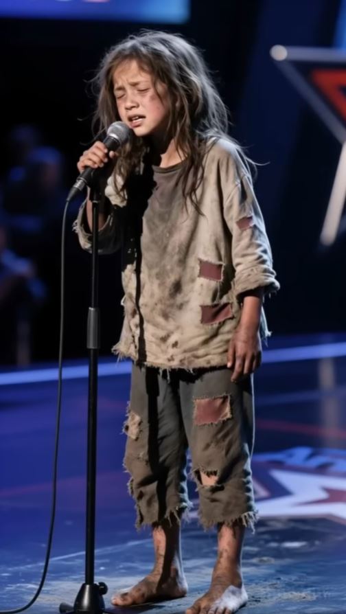 Instead, a barefoot little girl in ripped, dusty clothes walked slowly into the spotlight—quiet, fragile, and holding the microphone like it was her last chance.