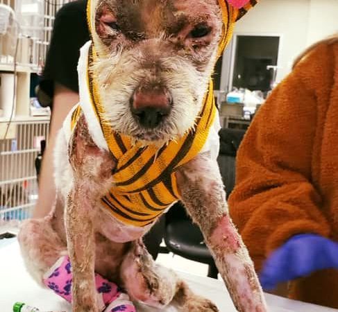 Rescue group 4 Little Paws rushed Phoenix to emergency care. Her injuries were severe—her skin was burned and hardened, her fur was gone, and her ears had to be amputated. Yet, through it all, Phoenix remained gentle and trusting.