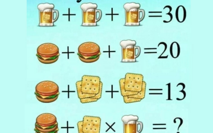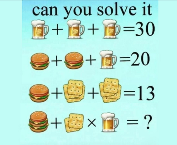 In the first line: 3 beers = 30 => 1 beer =10, but if you look closely, you’ll notice each beer contains 2 biscuits. Take note of that detail.