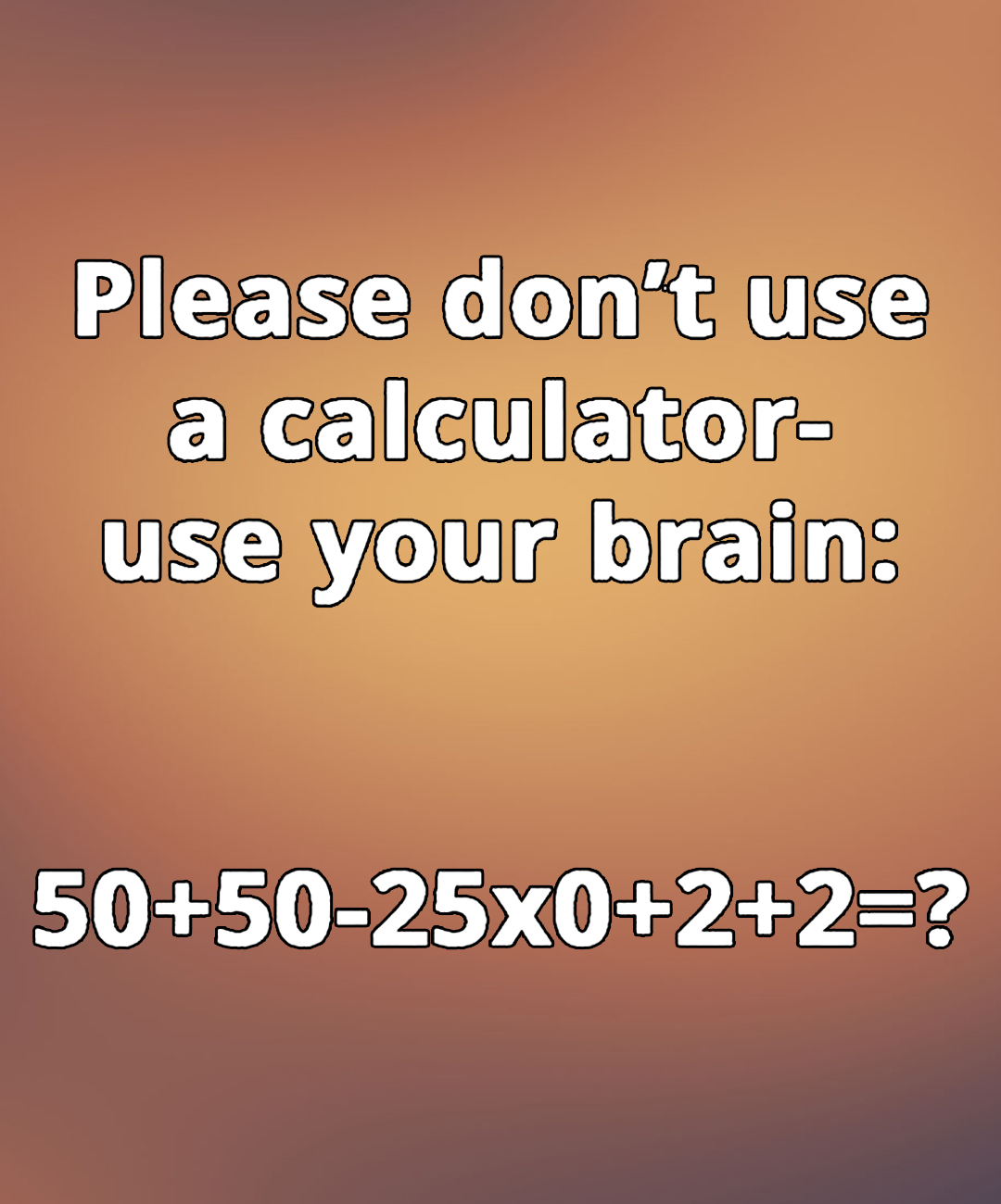 Here’s a math challenge: 50 + 50 – 25 * 0 + 2 + 2. At first glance, it seems easy, but the multiplication might trip you up if you’re not familiar with the order of operations.