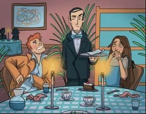 Here’s a tricky one for you: Imagine you’re dining in a restaurant with a friend. The man realizes his wallet is missing, but no one else knows—except for the suspicious waiter watching them closely. This image hides a secret—can you find the wallet in the scene?