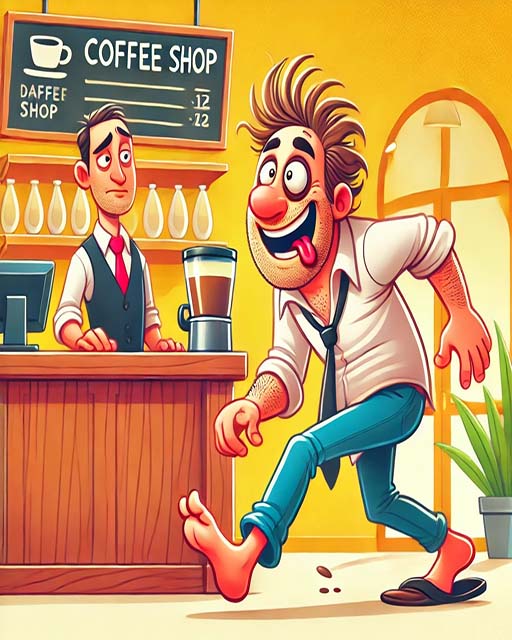 Last night, Dave had one too many drinks at the bar. This morning, still a bit tipsy, he strolled into his regular coffee shop. With his shirt half – untucked and one shoe missing, he didn’t even notice.