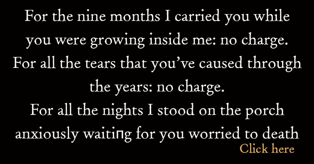 The list went on, detailing every moment she had given her love, patience, and time without asking for anything in return. She looked up at him and simply said, “Son, the cost of my love is $0.00.”