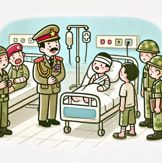 A general visits an army hospital to check on the conditions and inspire the troops.