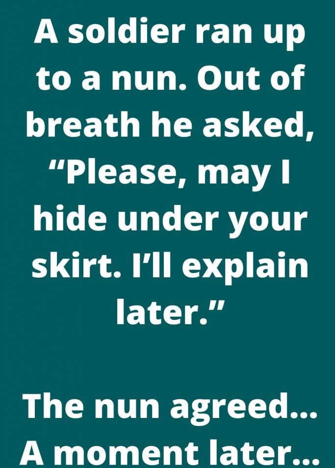 The nun smirked. “If you had looked a little higher, you would’ve seen a great pair of balls… I don’t want to go to Iraq either.”
