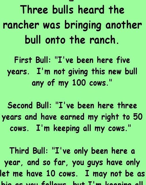 ? Third Bull: “I’ve only been here a year, and you two barely let me have 10 cows. I may be the smallest, but I’m keeping all 10 of mine!”